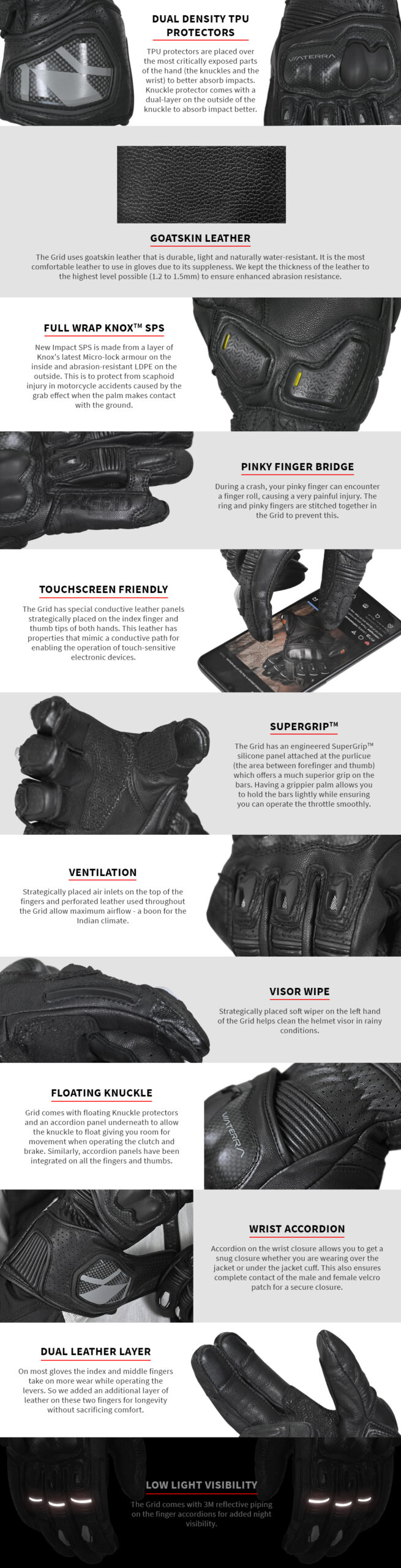 Bringing you the best of both worlds: race spec protection and daily use comfort. The Grid comes equipped with the same premium, top of the line KNOX SPS 404 protection used in the world’s most advanced gloves. Combine that with high density TPU protectors for knuckle and wrist, you have the best protection available for the Indian rider.